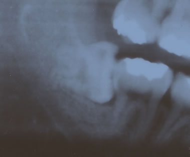 これは上の「おやしらず」です。手前の歯に引っかかって生える事が出来ません。